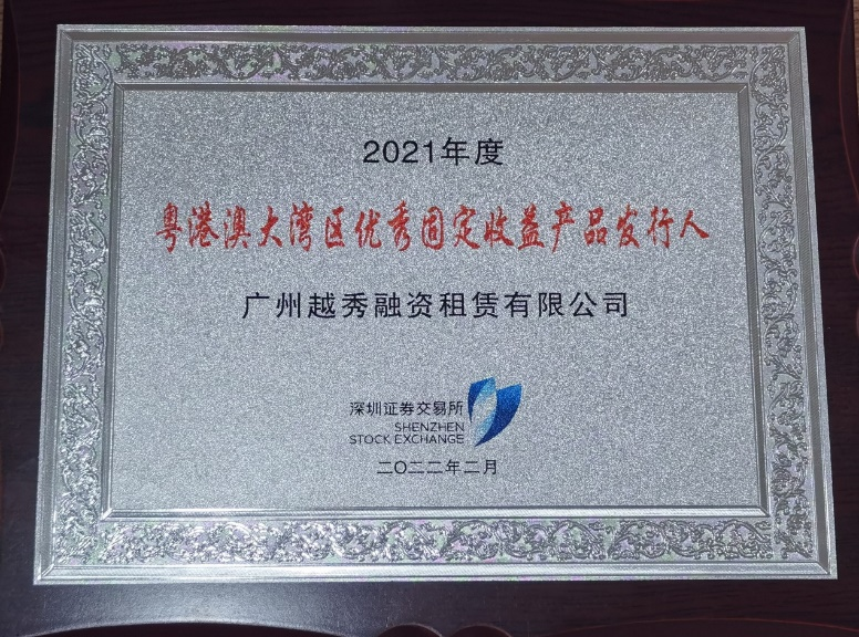 近日,越秀租赁获深圳证券交易所授予2021年度“粤港澳大湾区优秀固定收益产品发行人”奖项,标志着资本市场对越秀租赁债券发行、交易、存续期管理、信息披露等工作的充分肯定。