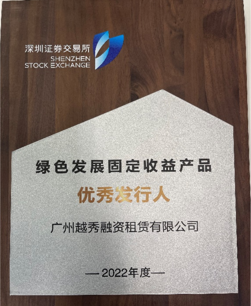 近日,越秀租赁凭借在债券发行领域,尤其在绿色债券发行方面取得的卓越成效,荣获深圳证券交易所2022年度“绿色发展固定收益产品优秀发行人”和“粤港澳大湾区固定收益产品优秀发行人”双重殊荣。