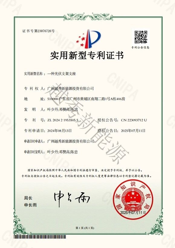 2025年7月越秀新能源荣获四项专利授权