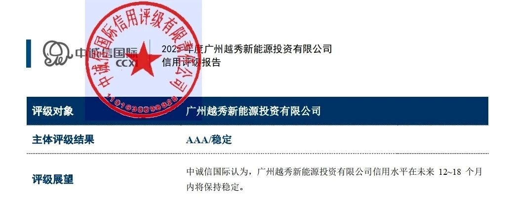 2025年7月越秀新能源荣获中诚信AAA主体信用评级