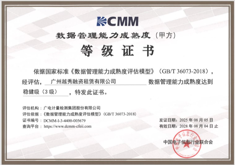 2025年9月越秀租赁荣获国家数据管理能力成熟度(DCMM)三级认证